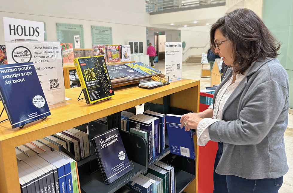 Doreen Horstin, manager of San Francisco Public Library’s Park branch, adds a book to the Read to Recovery shelves, which provide free addiction recovery materials to patrons.